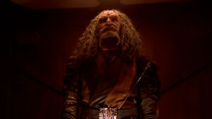 A brief respite of Martok telling war stories in the ship's mess hall is interrupted, when Kor joins them, and the crew is once again in awe. Noticing the tension, Worf attempts to change the subject by asking Martok to announce his plan of attack for Trelka V. Martok lays out his plan, which impresses the crew… only for Kor, in congratulating him, to note that Kor himself had once executed a similar plan against the Federation outpost on Caleb IV, along with his late comrade Kang. As the crew turns their attention back to Kor, Martok leaves the room in disgust.